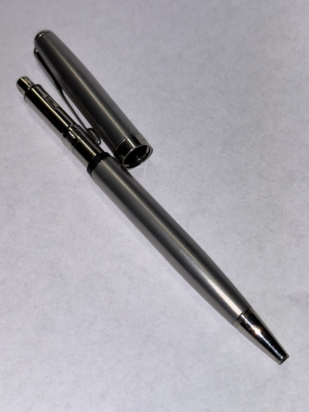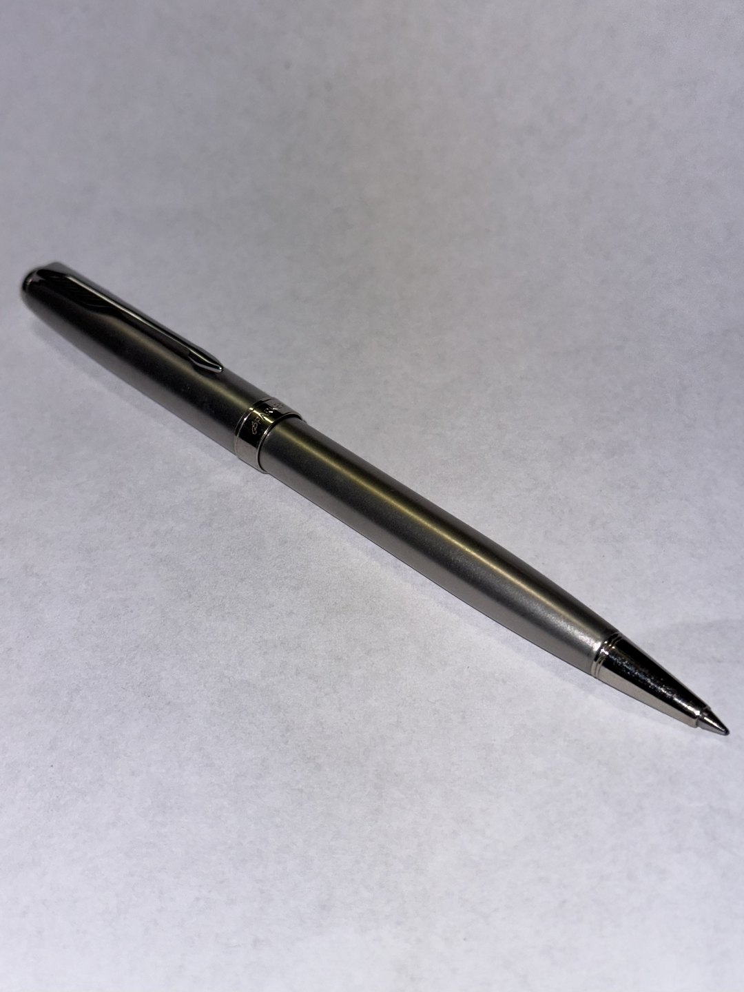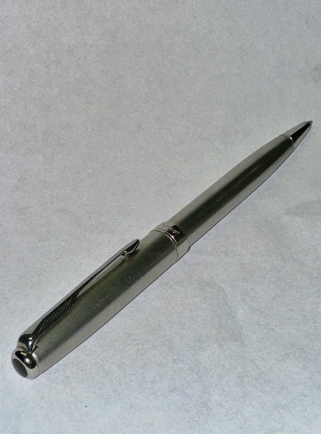 MADE IN FRANCE: Parker Sonnet ballpoint pen in Steel and Chrome. In good condition. Ready to use. Works with older refill. Black “pearl” on top. length 13.5 cm