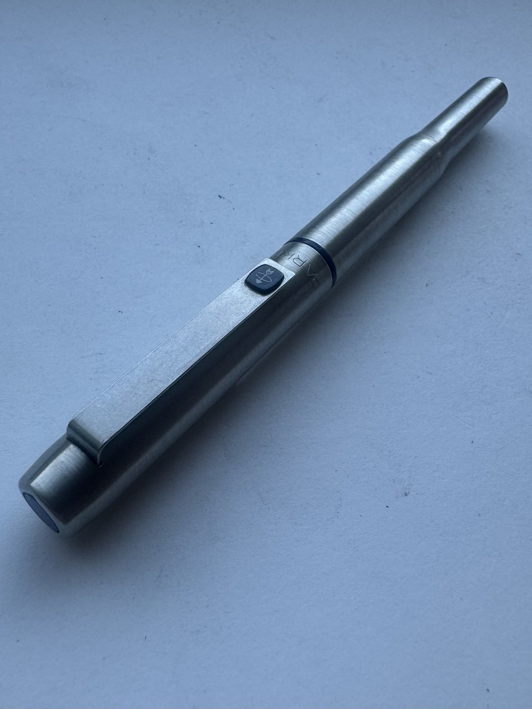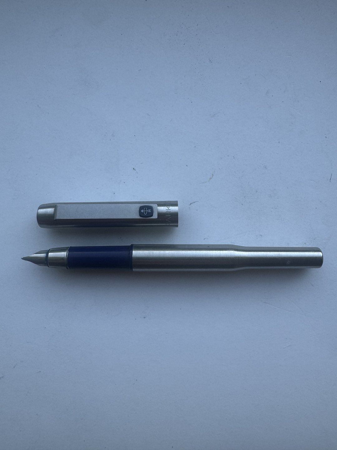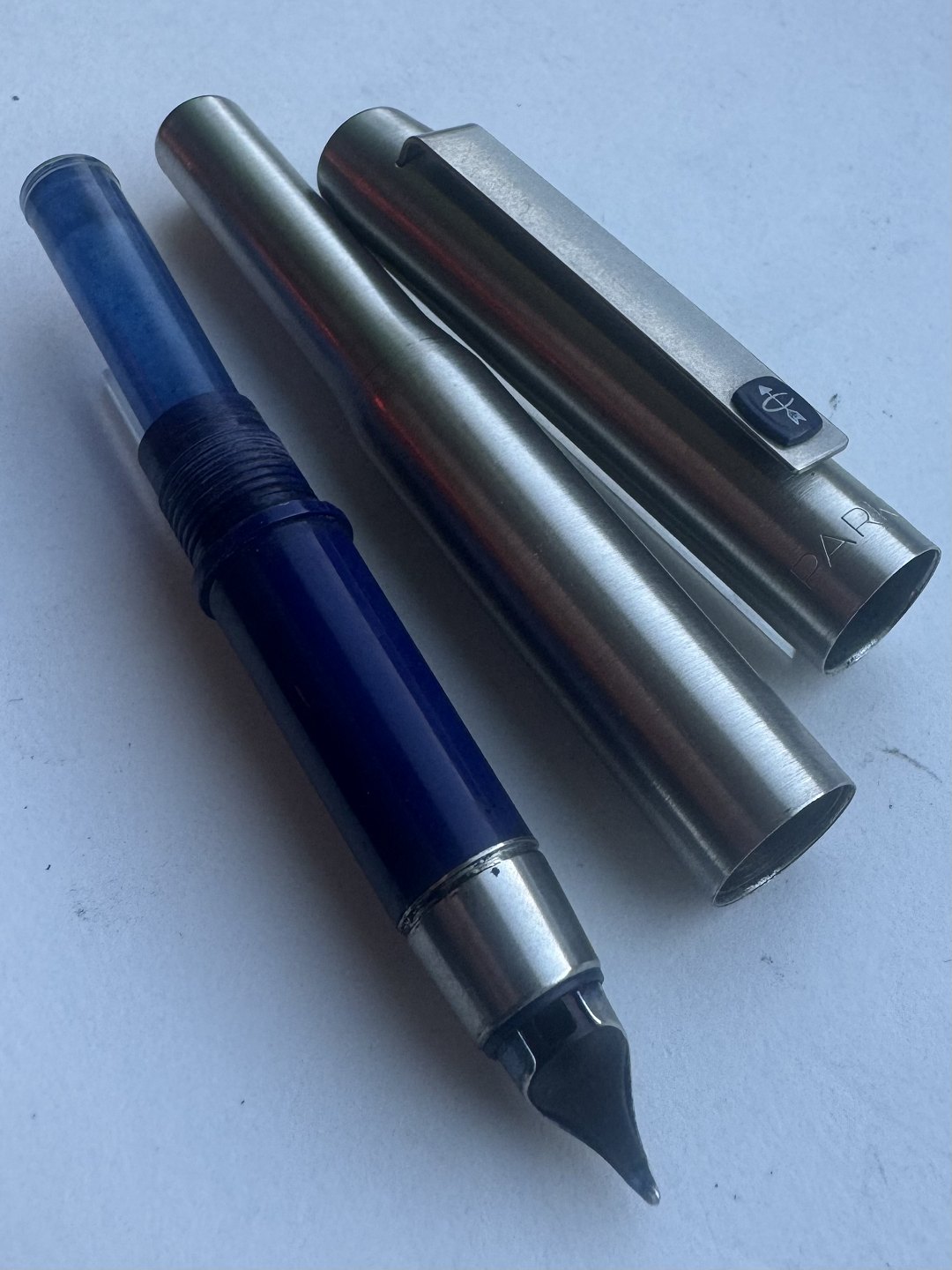 Parker 25 steel fountain pen made in the mid-1970s in England. Appears in good condition and ready to write when a new refill ink cartridge is inserted. 13.2 cm long.