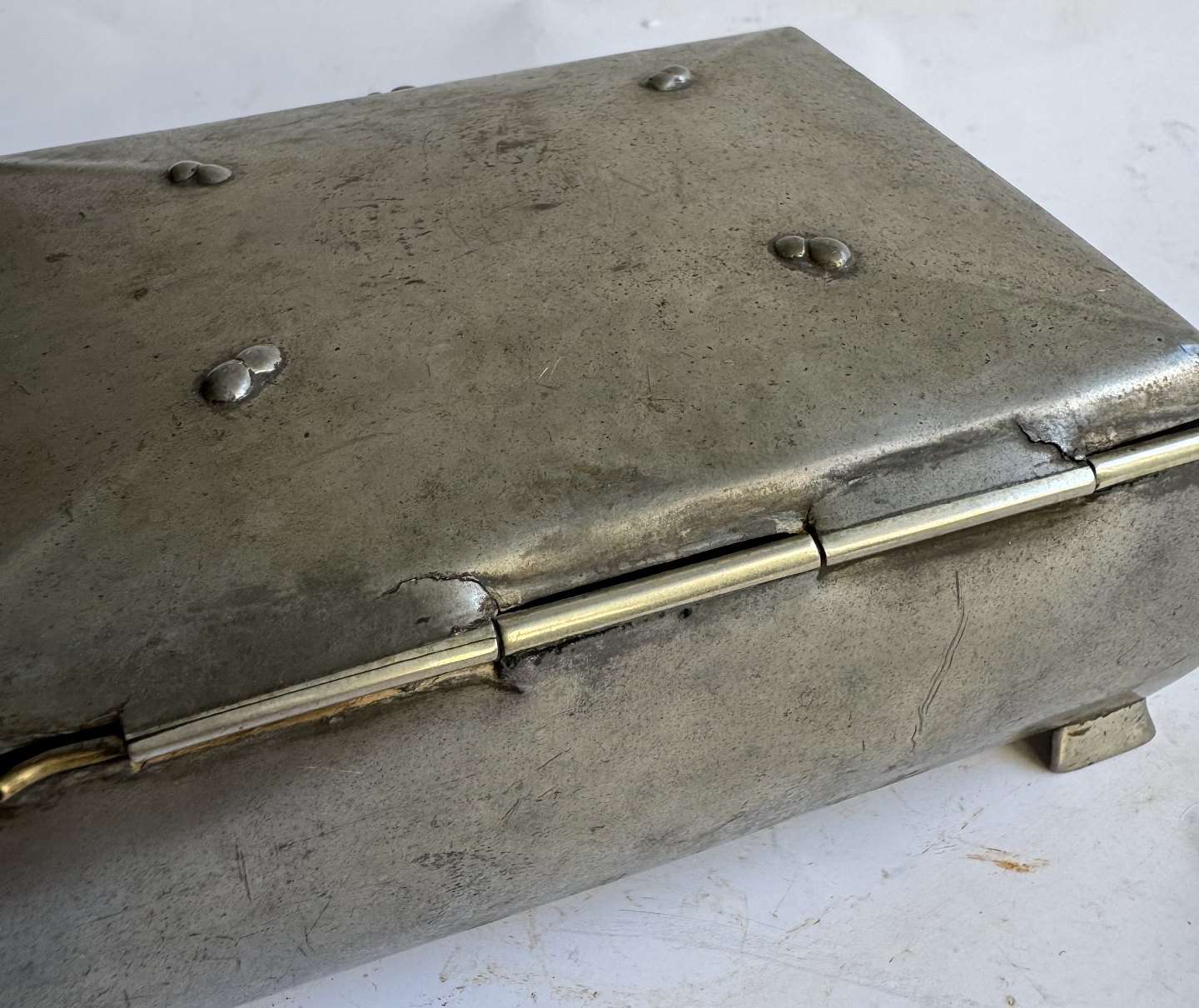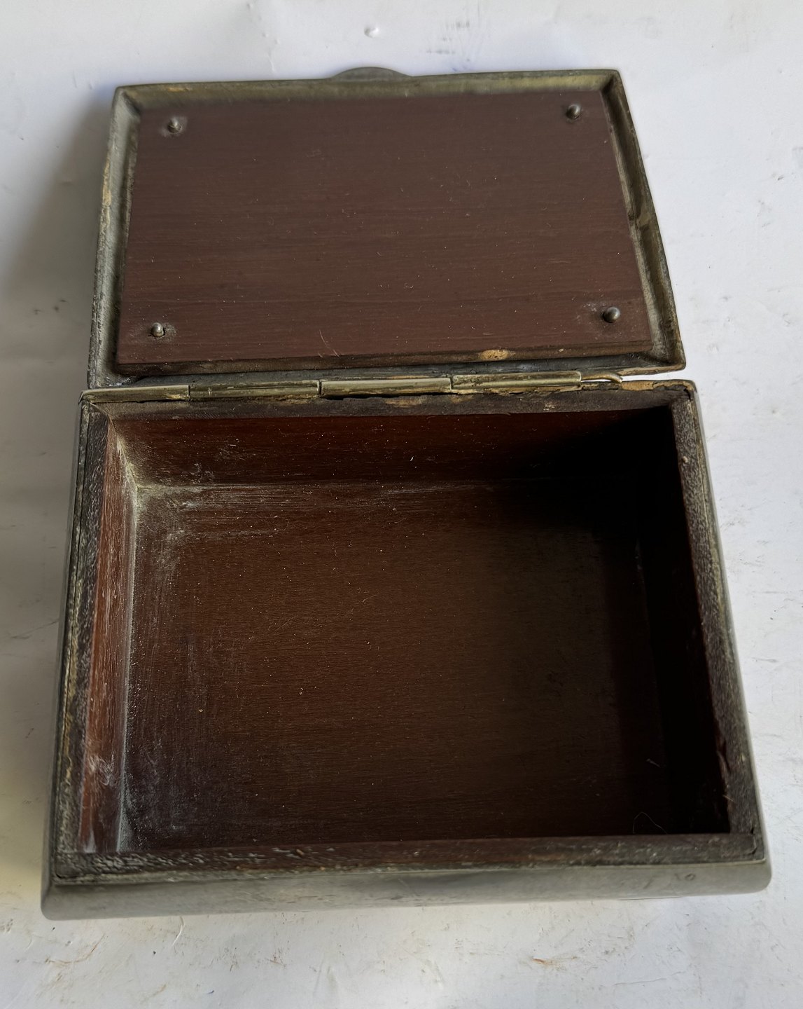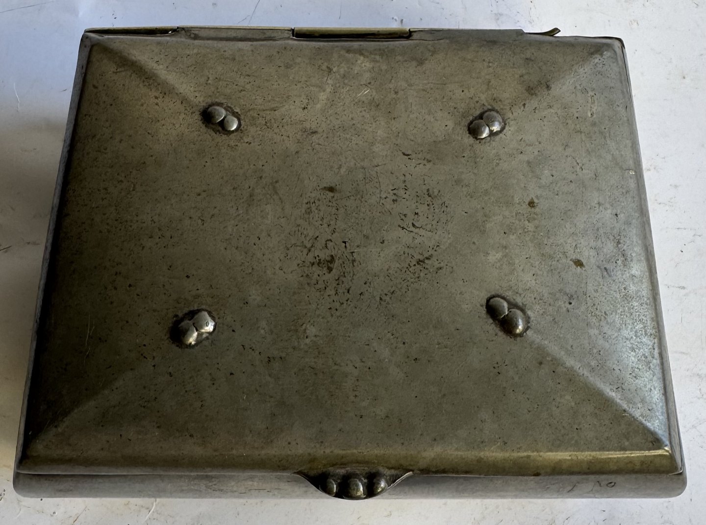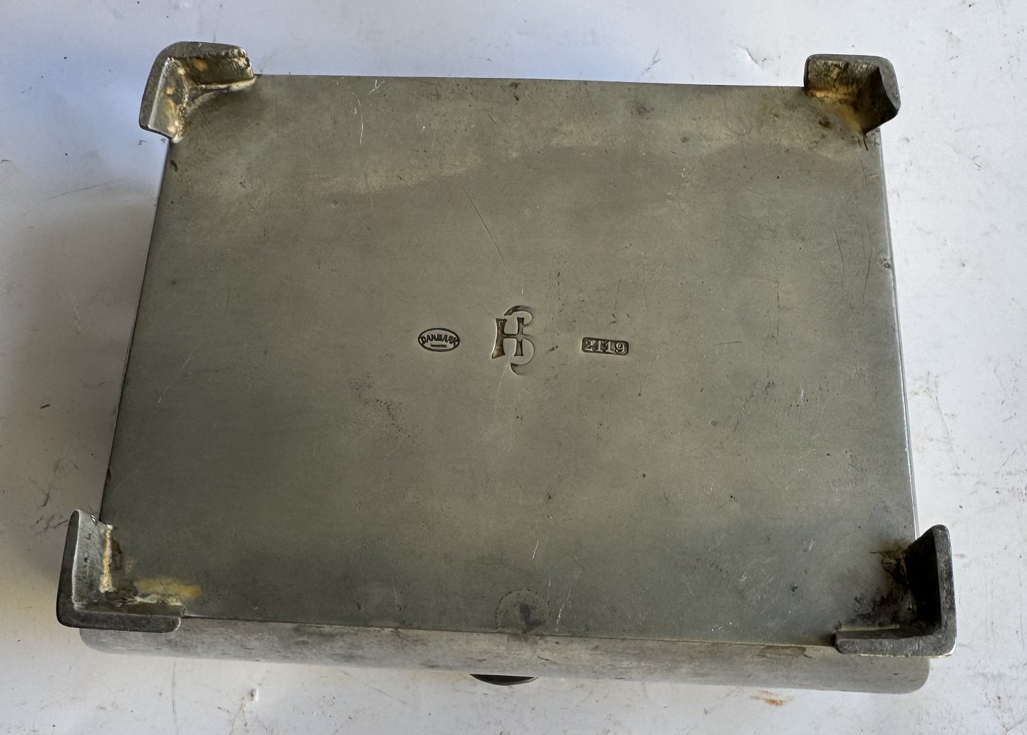 Art deco perioden: Skrin i tin. Fremstillet hos Mogens Ballin’s efterfølger Hans Peter Hertz (HPH) i 1921. Lidt brugsspor på låget. Ved hængslet (se fotos). Ellers i god stand uden skader eller reparationer. Aldersrelateret brugsspor indvendigt. Fabriksmærket på bunden med HPH. 2119. Mål: H. 5,5 cm Ø. Kassen måler 9 x 11,7 cm.