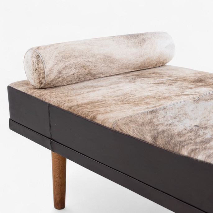 Daybed upholstered in cowhide with leather seat and beech wood legs.