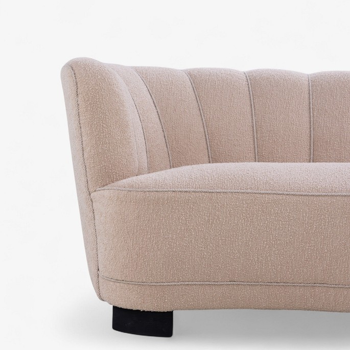 Newly upholstered 'Banana sofa' in 'Teddy' fabric (color: Nude).