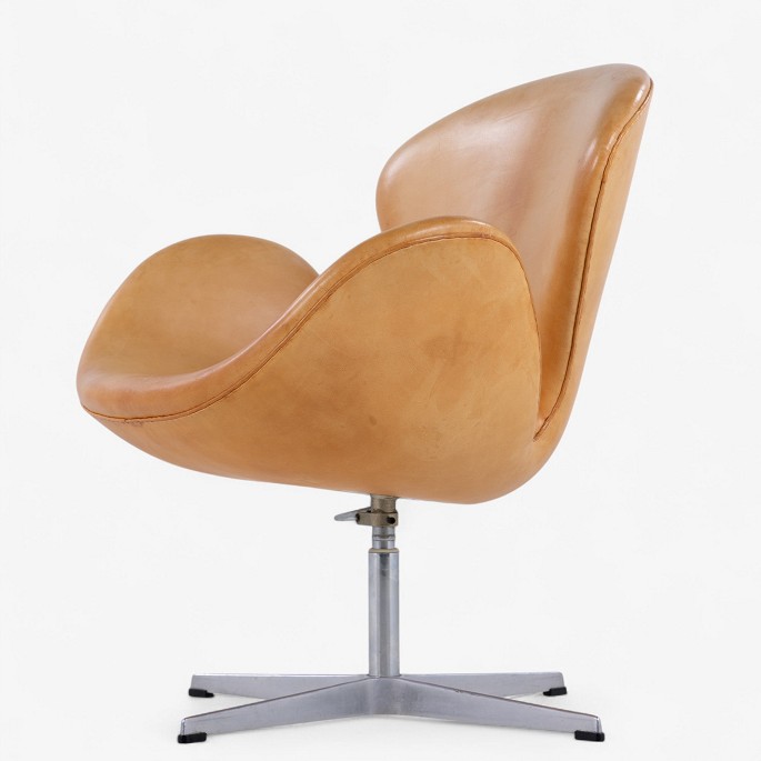 AJ 3320 - 'Swan' armchair in patinated natural leather on new base. Stamped by the manufacturer.