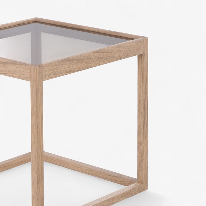 'Cube table' with light oak frame and smoked glass top.