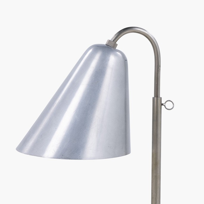 Sjælden bordlampe i forniklet metal med tragtformet skærm. Udført i 1930'erne.