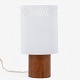 Cylindrical table lamp with a base in patinated teak and a shade in white lacquered metal.