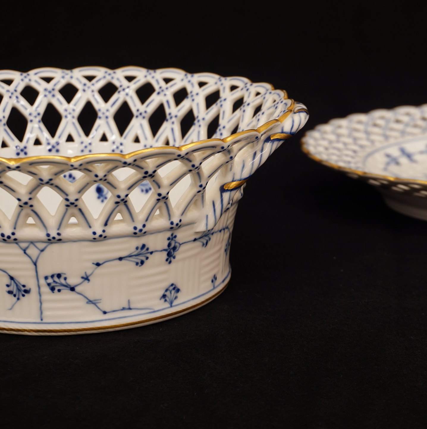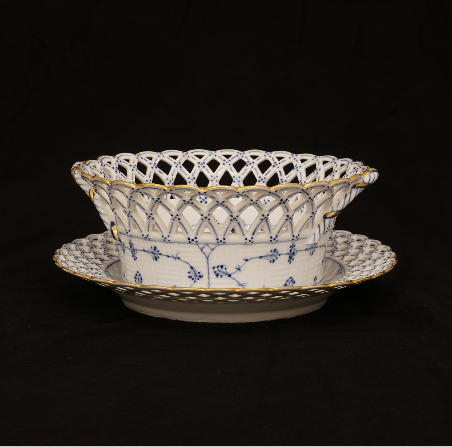 Royal Copenhagen blue fluted full lace fruit bowl with plate. Gilt