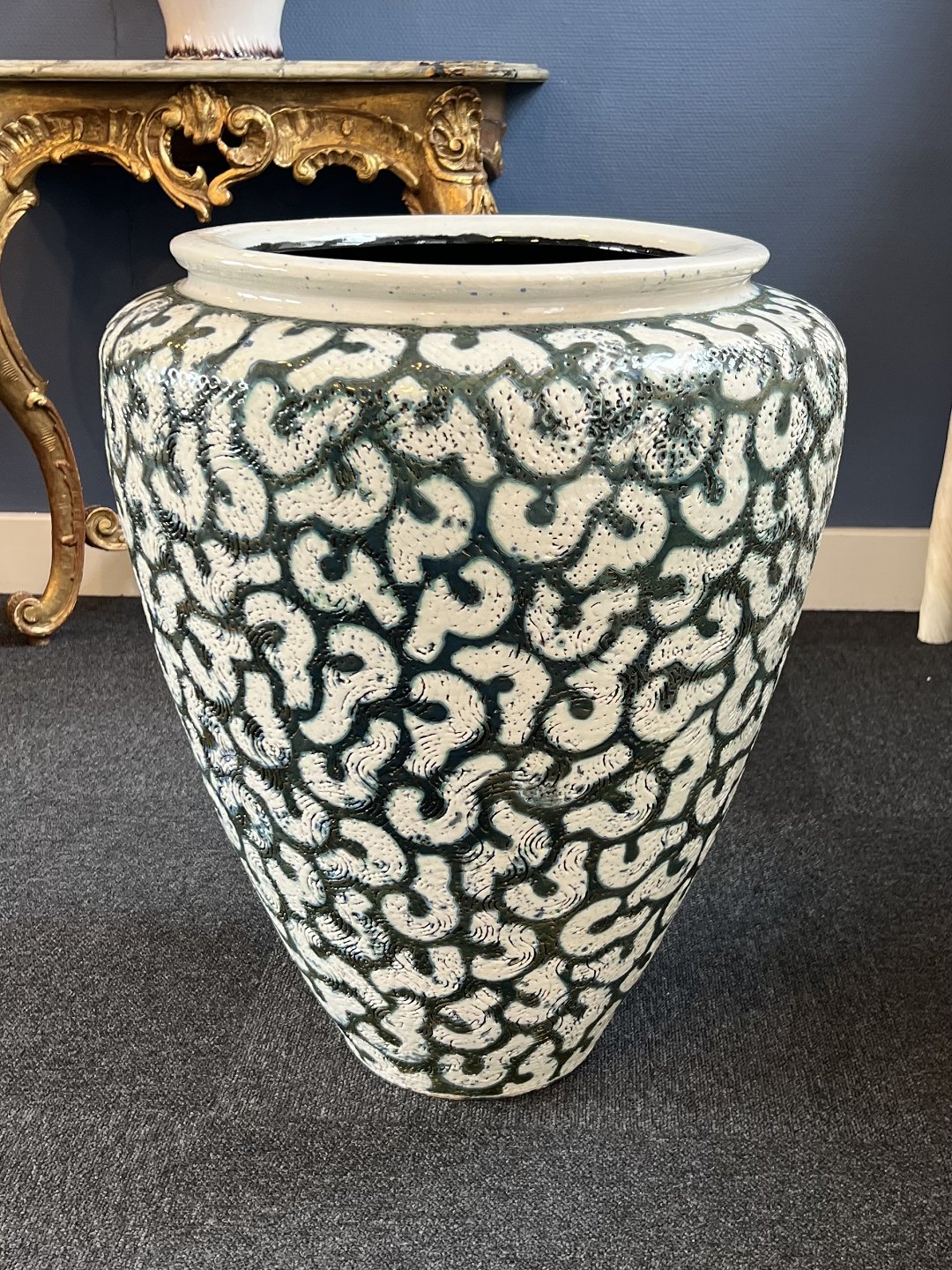 Stor Per Weiss stentøjskrukke med geometrisk mønster og grøn glasur med blå stafferinger. H: 59cm. D: 48cm