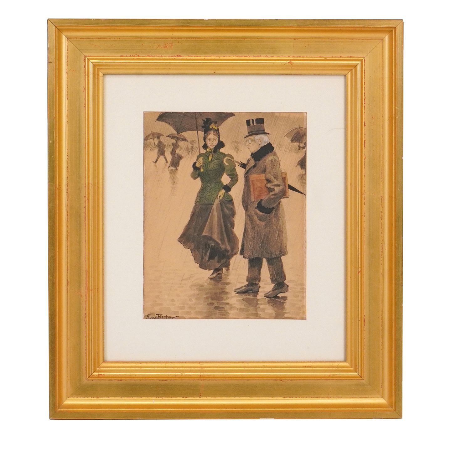 Paul Fischer, 1860-1934, ink and water color. A couple walking in the rain. Signed Paul Fischer. Visible size: 24x19cm. With frame: 46x41cm