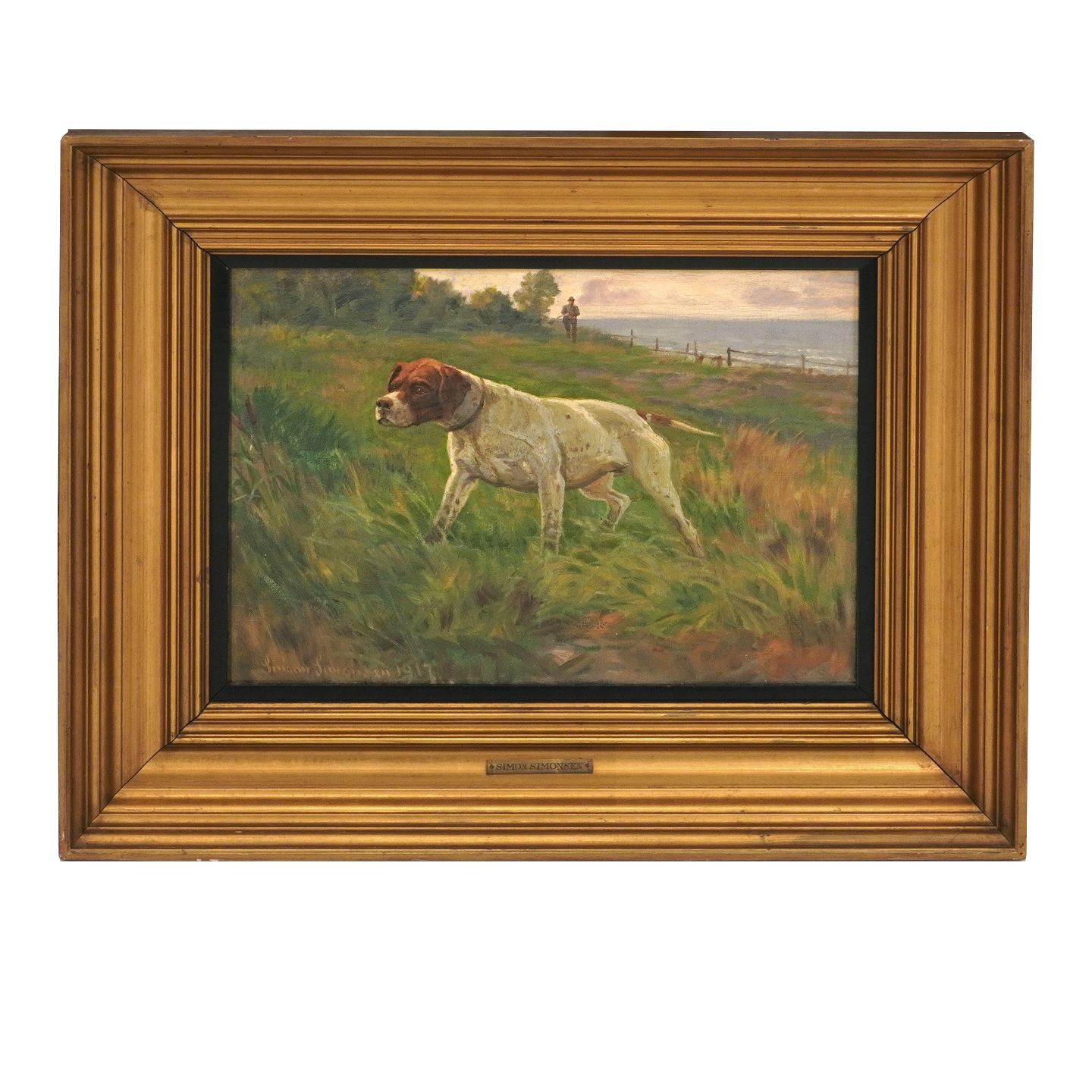 Simon Simonsen, 1841-1928, oil on canvas. Pointer with hunter. Signed and dated 1917. Visible size: 23x32cm. With frame: 39x48cm