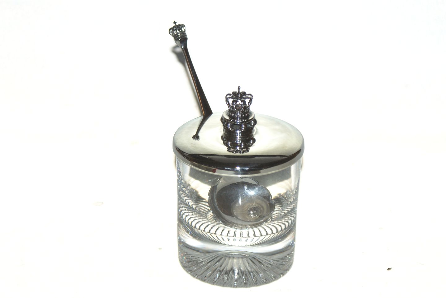 Danish crown Jam Jar, Sterling Silver Spoon length 15 cm. Diameter 8 cm. Height 12 cm. Beautiful and well maintained.