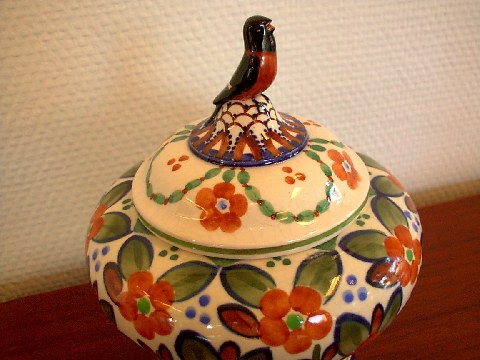 Gorgeous Aluminia Bonbonniere decorated with figurine of bird. It has decoration number 574/525. Height 16.5 cm. Diameter 14 cm. In the 1880s when production at the Royal Copenhagen factory was dropping to a dangerously low level they were taken over by Aluminia (founded 1863), successful makers of earthenware, and since that time the two ranges, earthenware and porcelain, have been running in tandem.