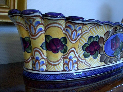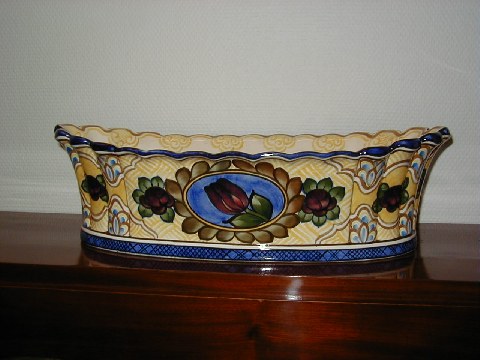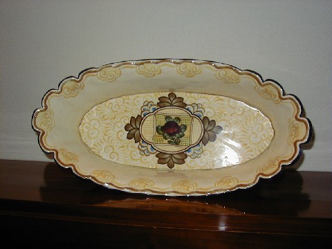 Incredible lare and beautiful Aluminia Faiance bowl for fruits. It is richly decorated both on the outside and inside. It has number 1128/799, measures 47 x 23 cm and 12 cm. in height. Perfect condition only with slight crazing in the glaze.