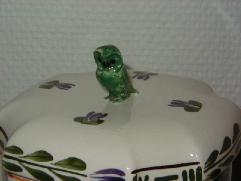 Aluminia Bonbonniere with a figurine of an owl, number 491/316, height 15 cm., top measures 13 by 13 cm. The lid has a crack.