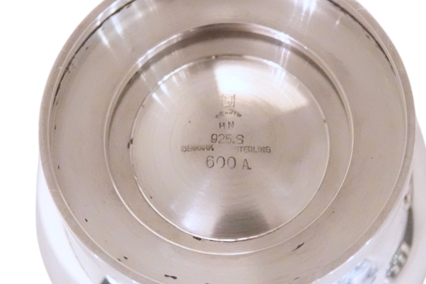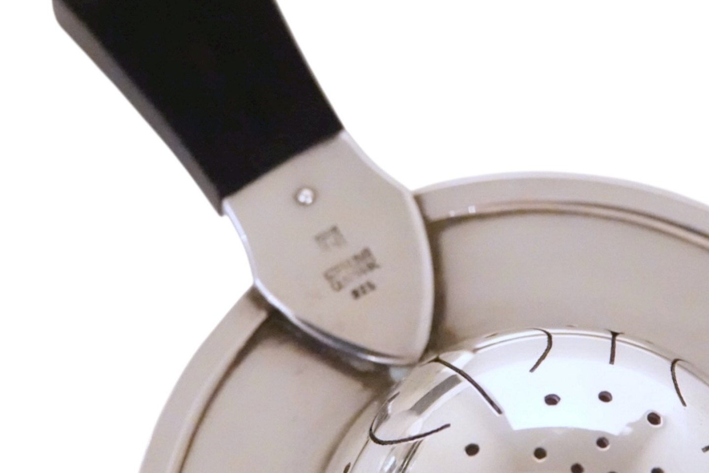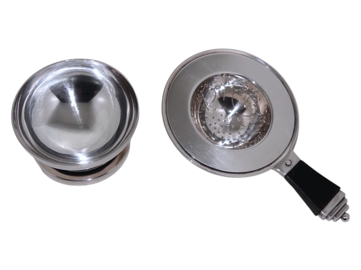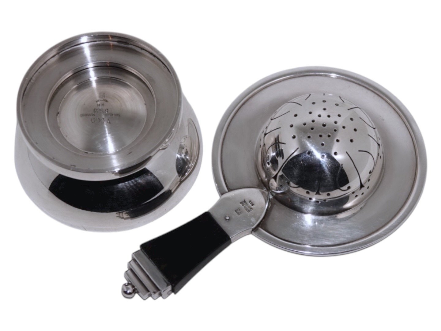 Georg Jensen sterling silver and ebony, Pyramid tea strainer on stand bowl.