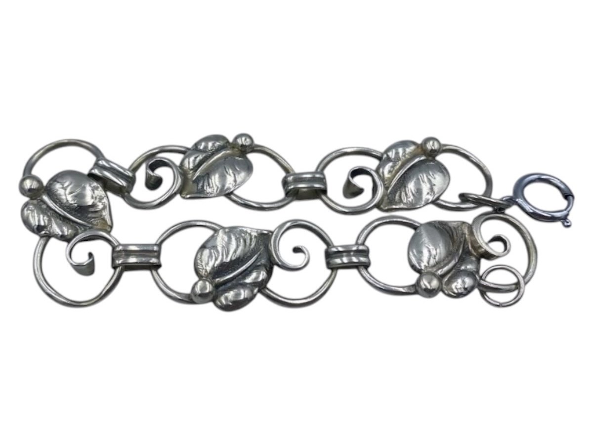 Sølv armbånd med blade fra ca. 1940 til 1960. Et led er formentlig taget af, hvor sølvstemplet har været, så armbåndet er ustemplet, men det er sølv. Længde 17,0 cm., bredde 1,4 cm. Fin og velholdt stand.
