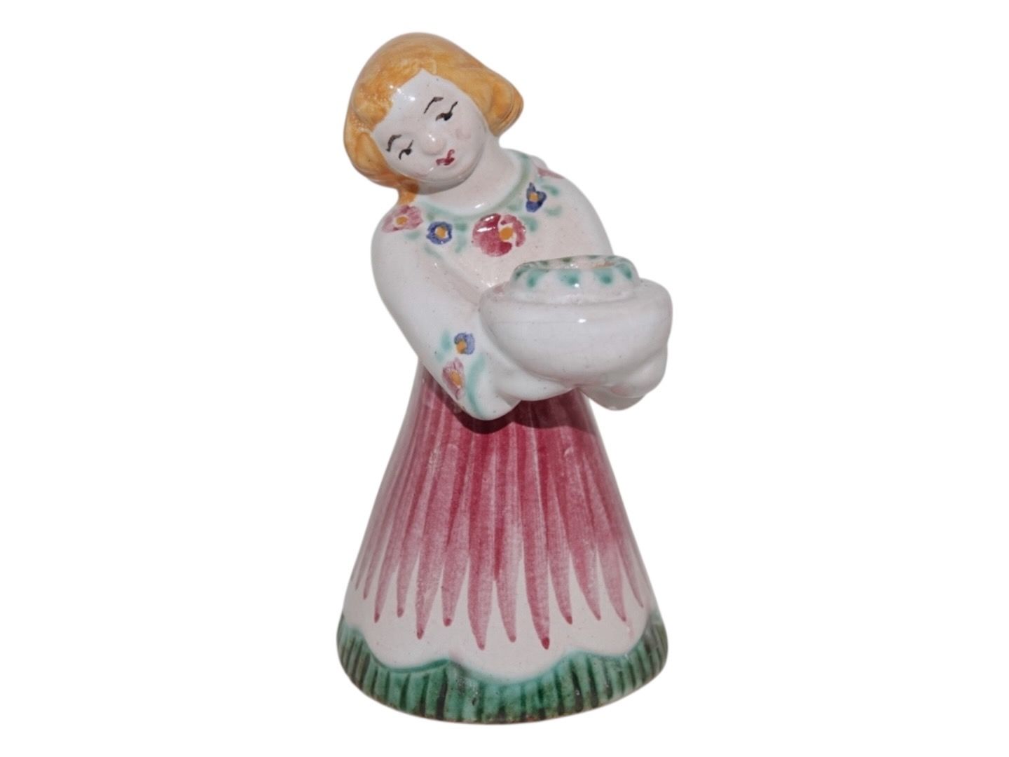 Hjorth Keramik, engel figur / lysestage med rød, grøn og gul dekoration. Dekorationsnummer 420. Højde 11,5 cm. Perfekt stand.