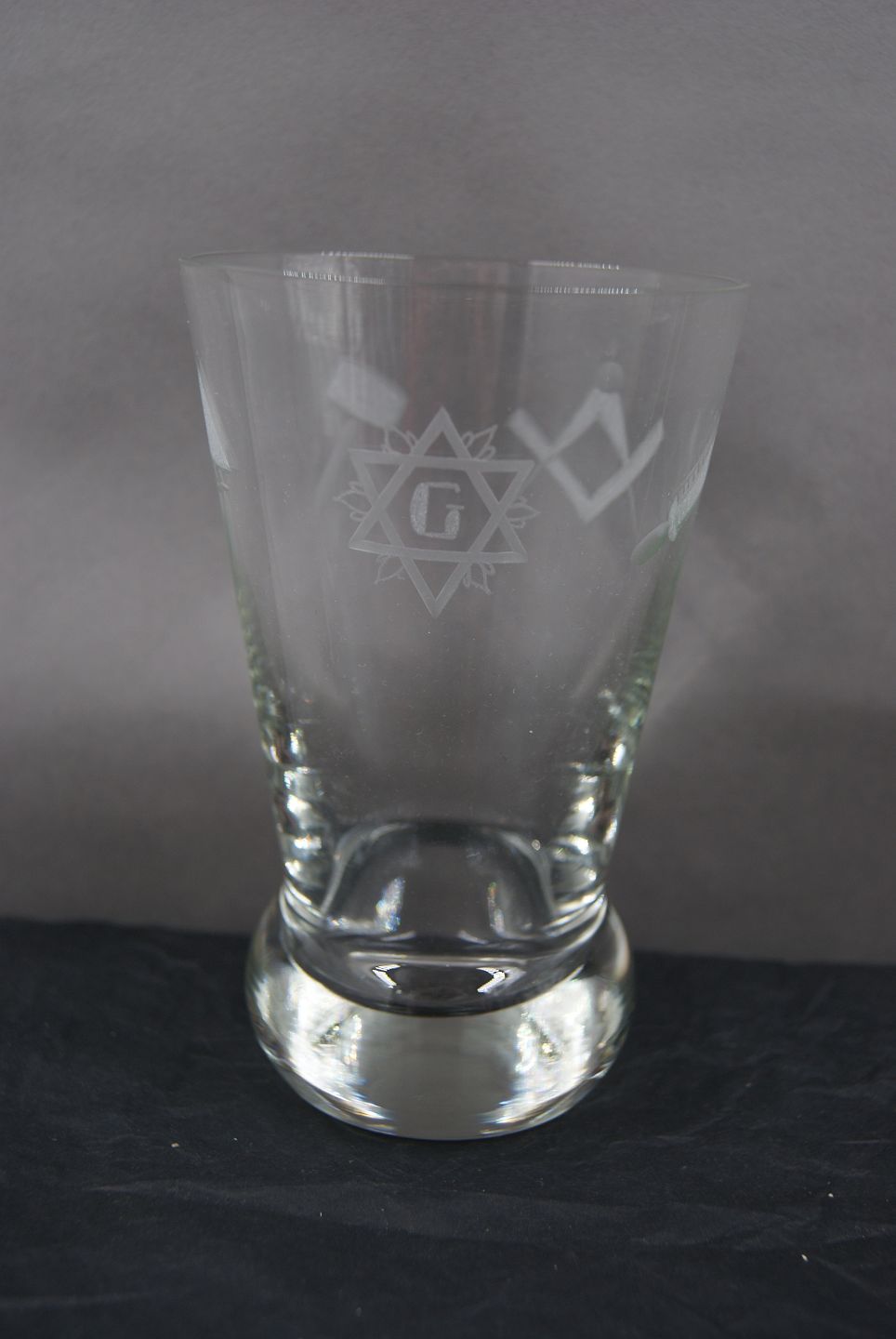 Danish Masonic glass or Freemason beer glass engraved with freemason symbols on a round foot.