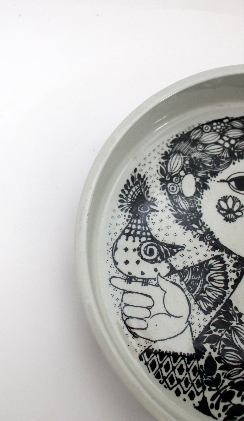 Frugtskål, Bjørn Wiinblad, Nymølle. Diameter 22 cm. Højde 4,5 cm. Der er lidt ujævnhed i glasuren på kanten ellers fin stand. Pris: 300 kr. stk. Lager: 1
