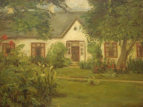 Usigneret maleri - hovedbygning med smuk have.