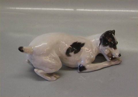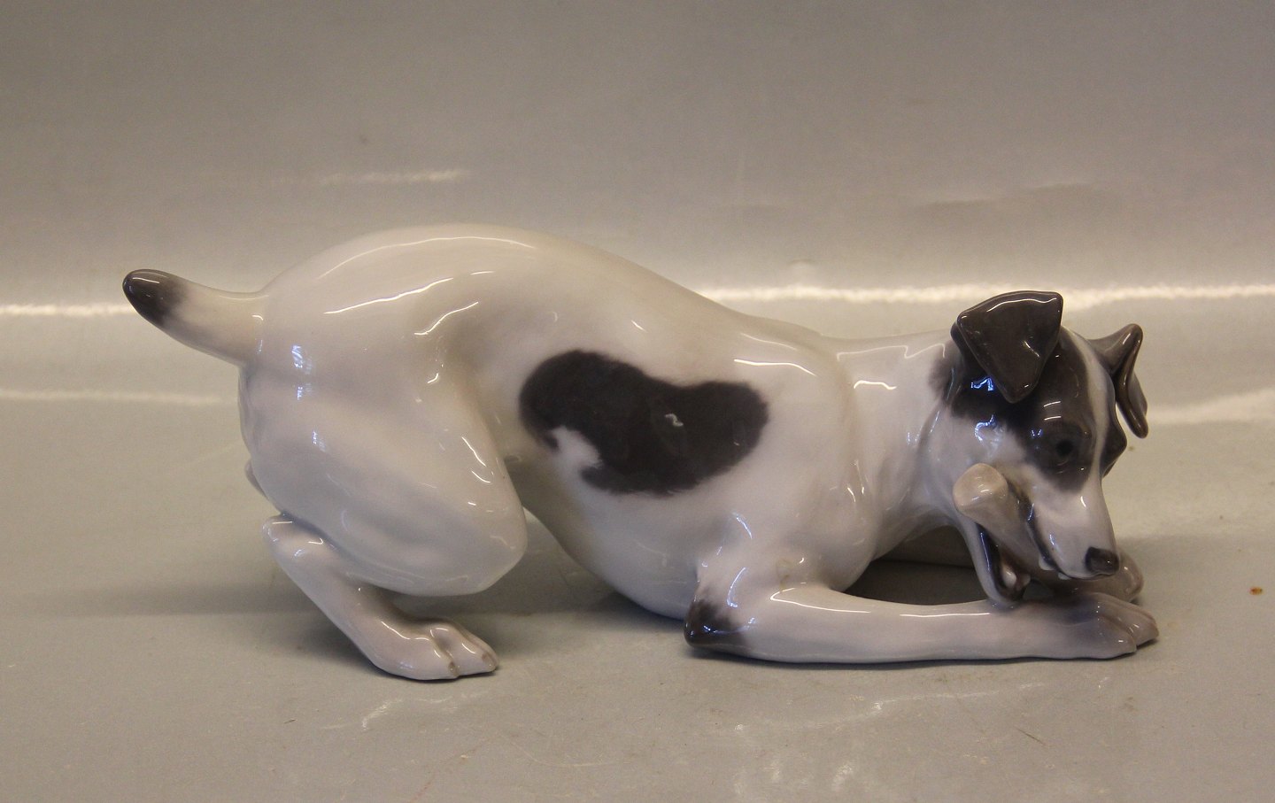 Royal Copenhagen Smooth haired fox terrier 0704 RC Terrier with bone, Chr. Thomsen 1905 Color: Black 9 x 23 cm