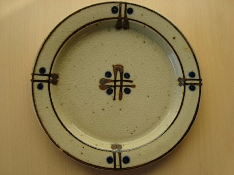 Ecru/grå fond med brun stregdekoration og blå polkadots.