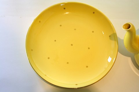 Text available in Danish: Søholm, Bornholm. Kaffestel i gul blank glasur med guldstjerner. Produceret i "guldperioden" 1955-1960.