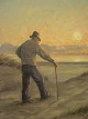 Text available in Danish: Maleri af Lauritz Sørensen - Gammel mand med stok i klitterne ved solnedgang.