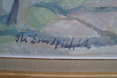 Maleri af Ole Sværdpiil 1962 - Landskab med huse og nøgne træer.