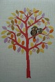 Text available in Danish: Korsstingsbroderier på hørlærred. "Træer med fugle" - den grønne er solgt.