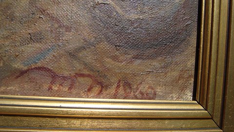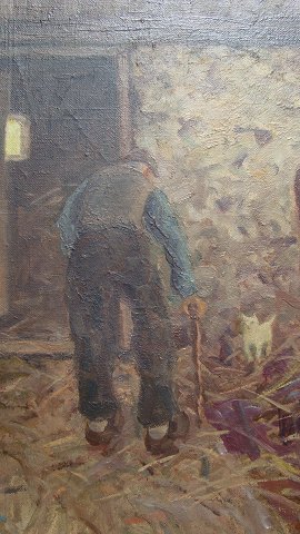 Maleri af Mouritz Nørgaard - Gammel mand og kat i stald 1960.