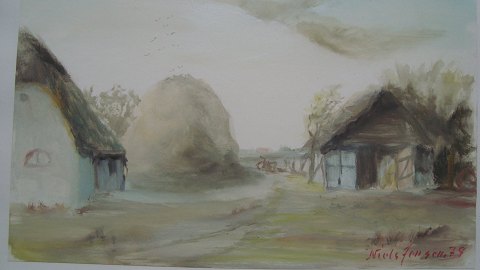 Text available in Danish: Gouache af Niels Jensen 1979 - parti fra bondegård ved Blokhus.