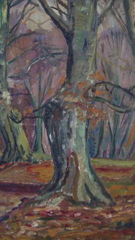 Maleri - Efterårsskov med hus.