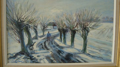 Maleri af Chr. Dybdal - Vinterparti med person på vej.
