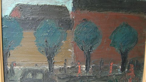 Maleri af Peder Brøndum Sørensen 1959 - Biler og cyklister ved vej og huse.