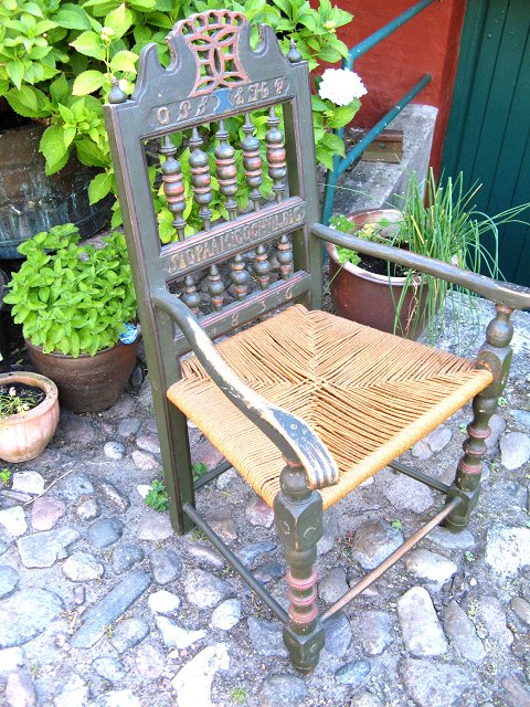Bemalet Lars Hugger stol år 1836 Højde 107 cm. Bredde 69 cm.