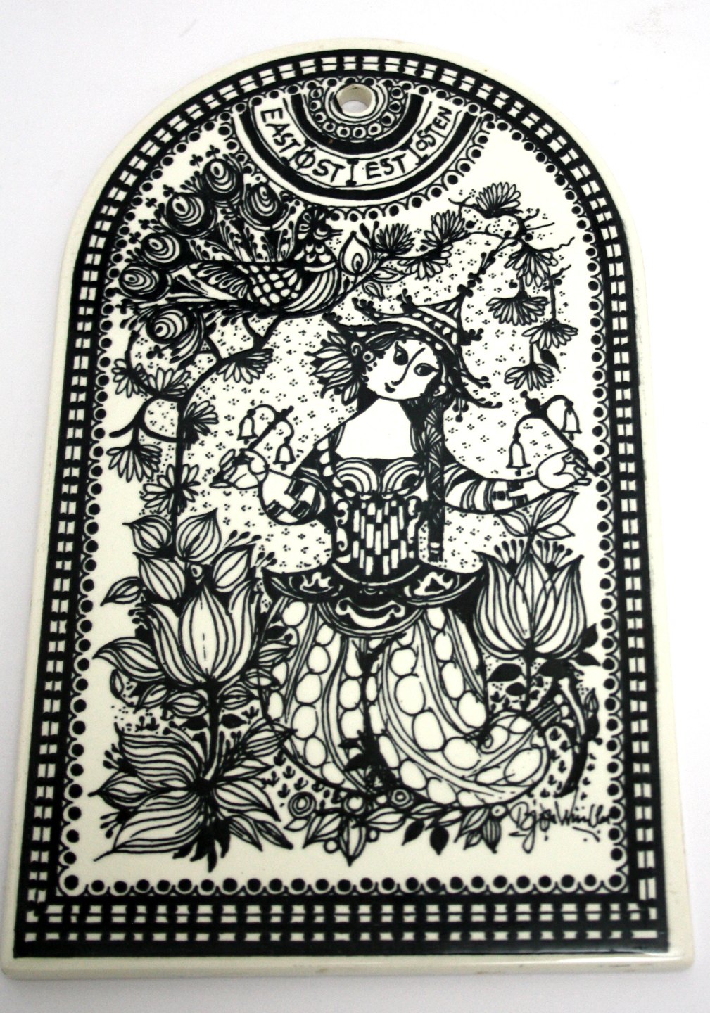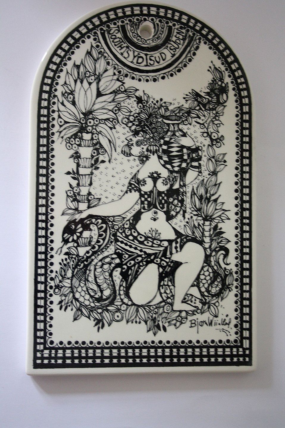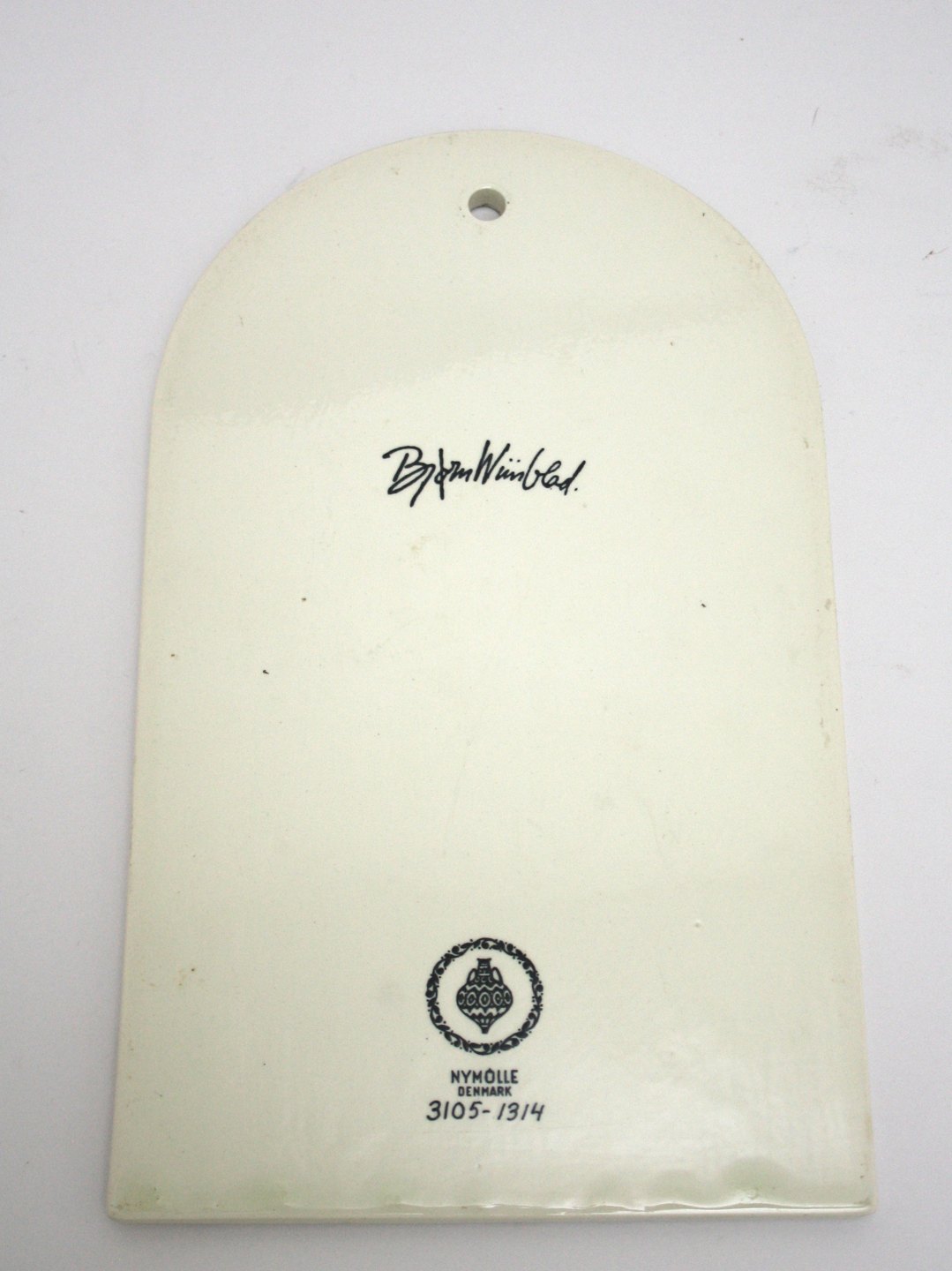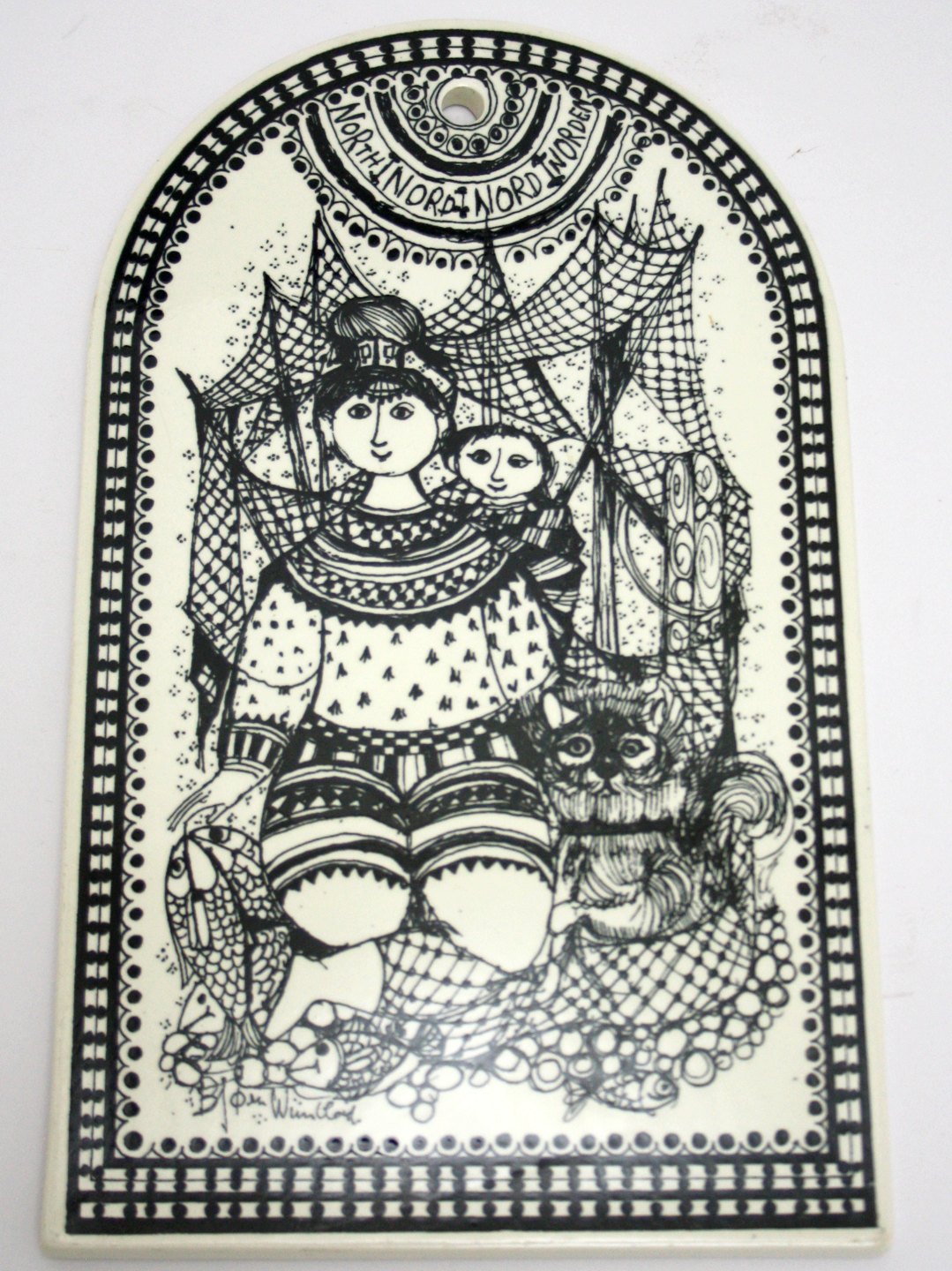 Text available in Danish: Bjørn Wiinblad, Nymølle, Denmark, spækbræt, platter med motiver fra de 4 verdenshjørner, Syd, Nord, Øst og Vest. Mål 25 x 15 cm.