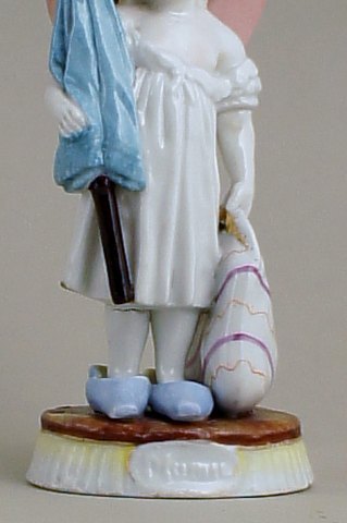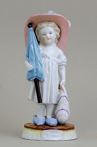 Milano, G. Richardi, ca.1860-70. Pige med sommerhat, taske og paraply i porcelæn. Håndmalet i polychrome farver. I god stand, lille brændingsfejl. 19 cm. høj.