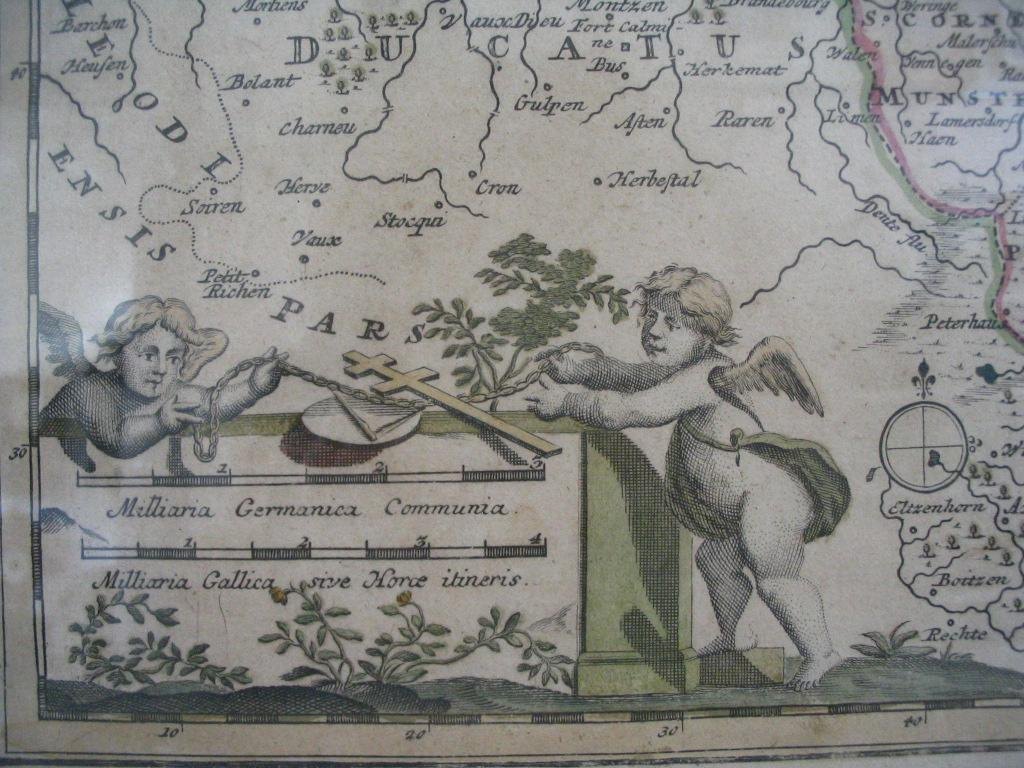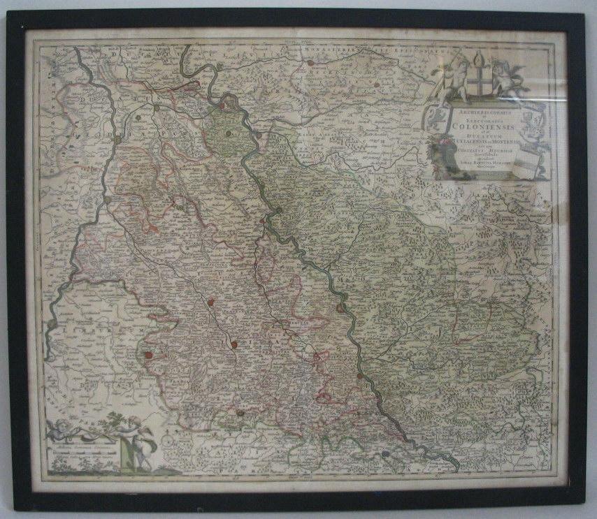 Landkort, 17. årh. Kølns ærkebispedømme, ´"Archiepis copatus m.m", udformet af Johan Baptista Homanno, samtidig håndkoloreret, 50 x 60 cm.