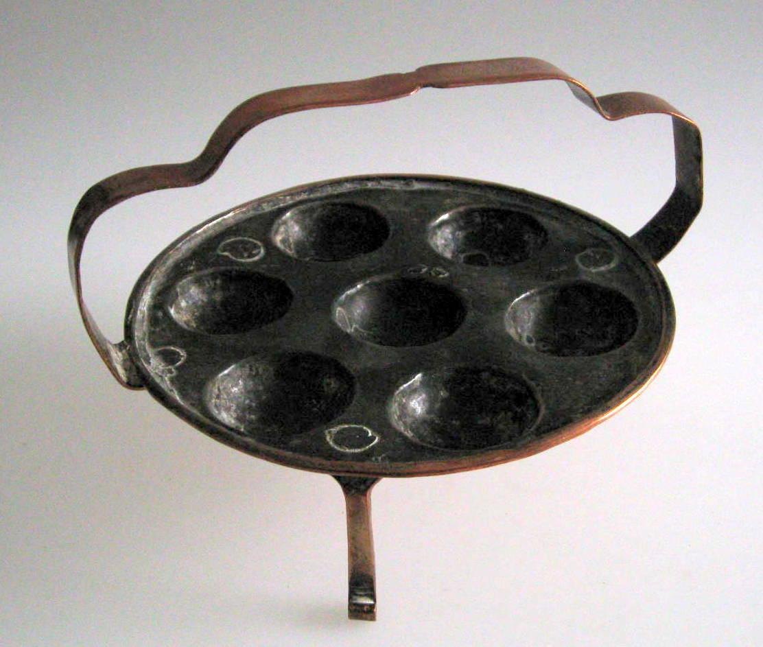 Antique batter pan in copper, 1842. On tripod with handle. Inside tinned. With the following inscription: Ane Haldner 1842. Provenance: Family from The South of Jutland.