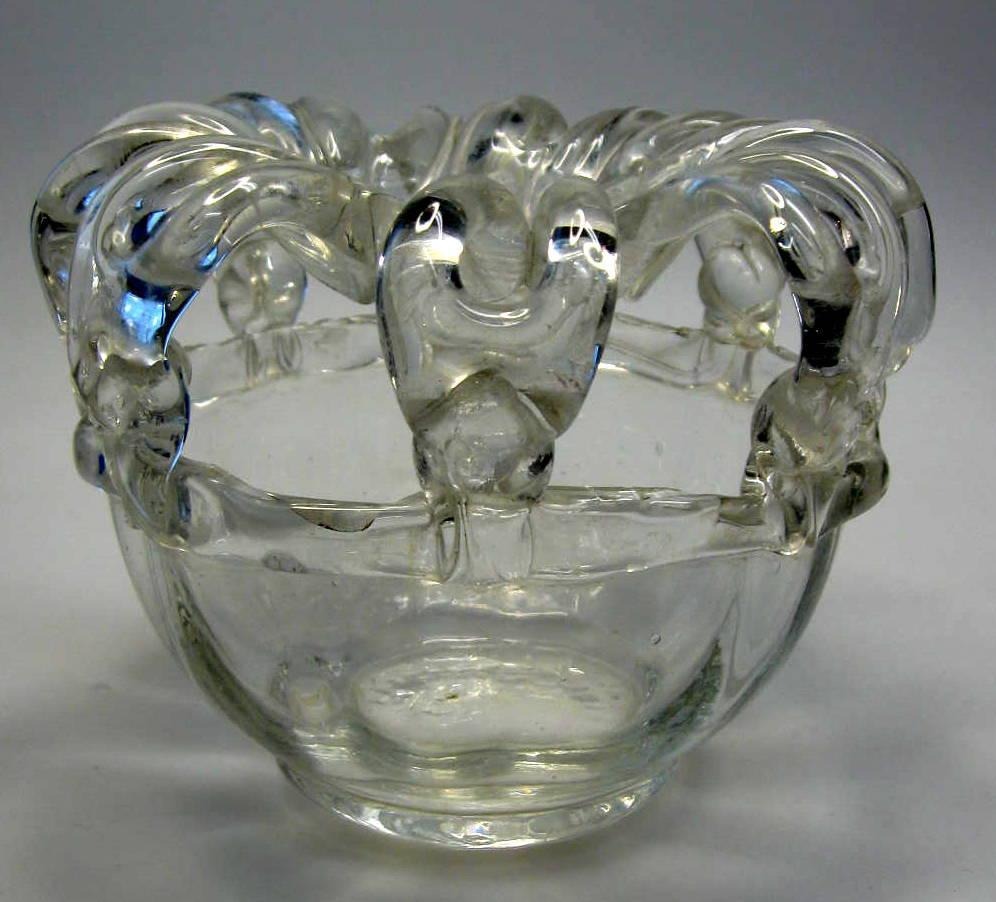 Bridal crown in glass, ca.1900, Denmark. Large. H: 12 cm. Dia.: 16 cm. Optical finish. With periulcer base. Provenance .: Aarhusian family. Probably made by apprentice from Aarhus Glasværk.