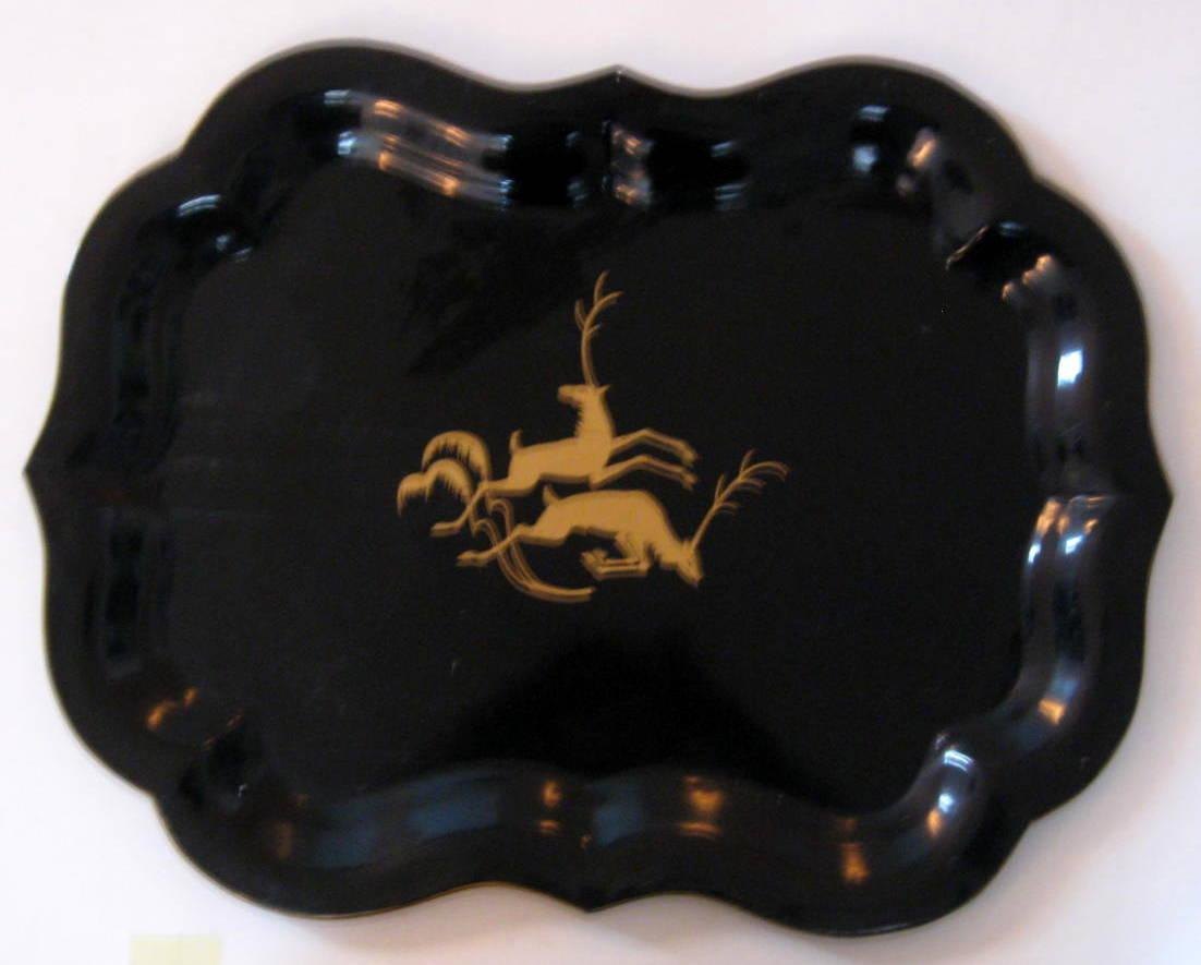 Metal tray, 19th century. Black painted metal. Rococo shape. Decorated with leaping deer. L .: 62 cm. B .: 48 cm.