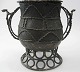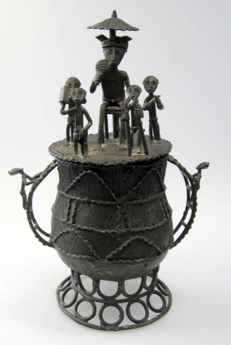 Bronze jar with lid, 20th century, Benin, Nigeria, Africa, Cast perdue, unique. The lid decorated with a king and his people that play. The jar on a pierced foot jar with handles in the form of people who climb ladders. H .: 29 cm.