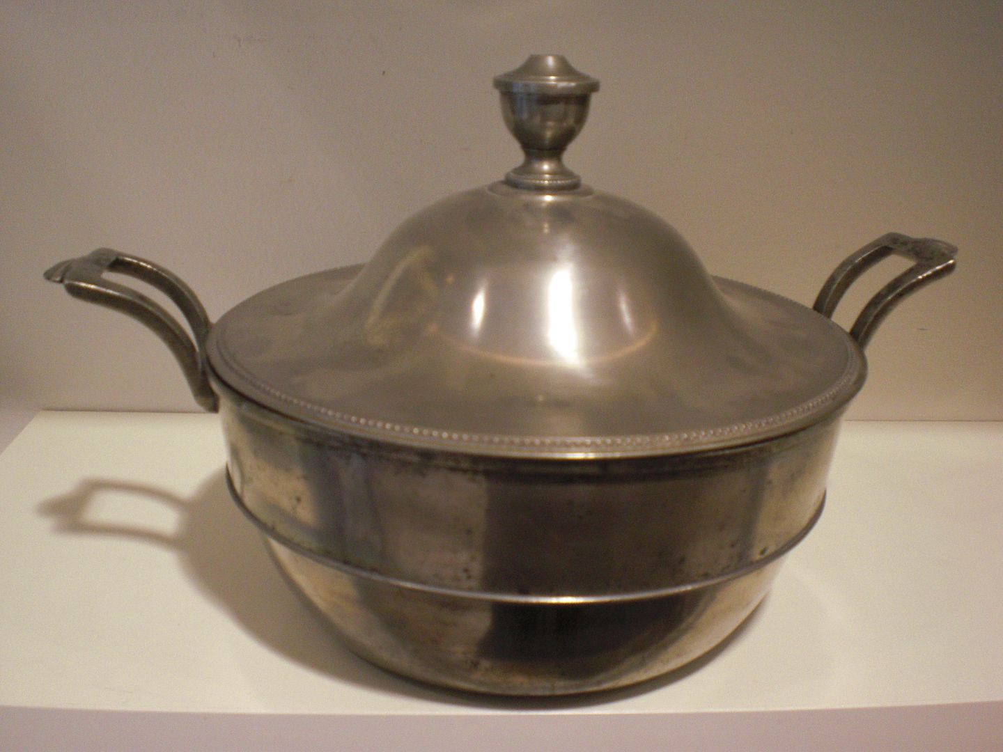 Tinterrin med håndtag med havskaller - knop på låg med perlekant. Nordtysk 1810 - 1820. Højde: 21 cm - diameter: 22 cm.
