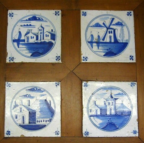 Firpas med hollandske fliser, dekoreret med bygninger. Blåmalet. Medio 1800-tallet. 1800 - 1850. Hjørnedekoration i form af Edderkoppen "n'spinnekop". 13 x 13 cm. Nedlagt i fyrreplade, 41 x 41 cm.