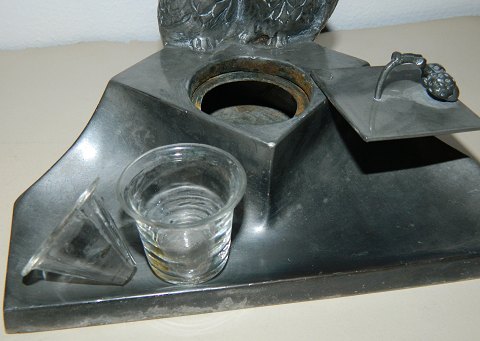 Inkwell in pewter from Mogens Ballin successor H. P. Hertz. Decorated with a pair of owls. Glass insert in good condition. pewter parts and glass with no damage or repairs. Factory marks on the bottom. Produced in 1917. Unknown artist. Dimensions: 9½ cm high and pen tray is 18 cm long.