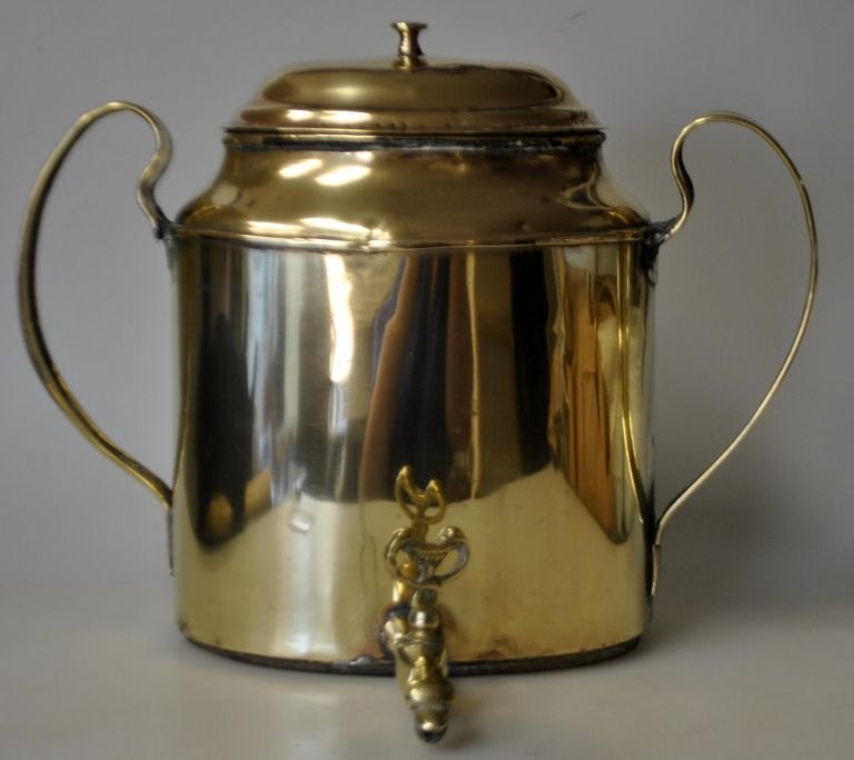 Water machine, empire, brass, c. 1810 - 1820. Denmark. Smooth body with two handles and tap in the form of dolphin. On brazier with lion feet. H .: 31 cm. B .: 24 cm.