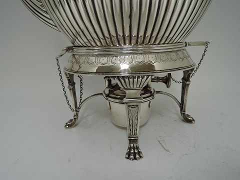 Hot water kettle and burner. Silver (830). Made by Michelsen, Copenhagen. Produced 1897. Height 29 cm
