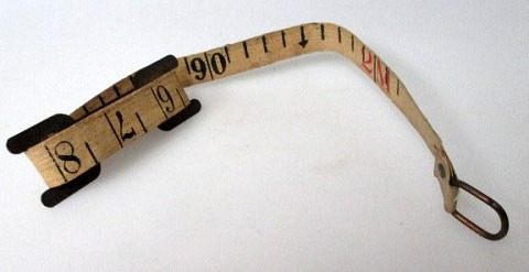 Målebånd, 19. årh. Danmark. Viklet op på jernplade. 2 m. lang.