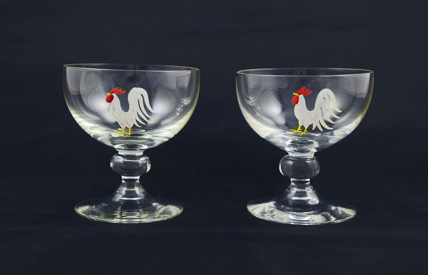 Text available in Danish: Cocktailglas fra Holmegaard med motiv af en kok/hane produceret i perioden år 1943-45. Glassene er i perfekt stand. Højde: 8 cm. Ø: 7 cm.