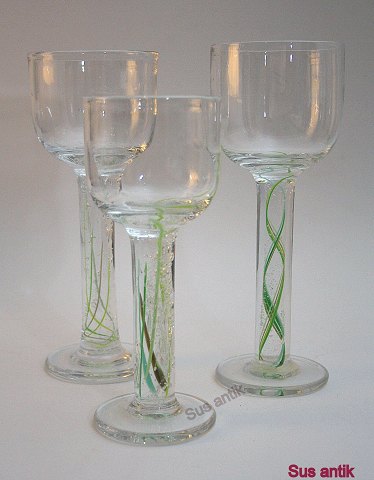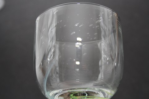 Text available in Danish: Vinglas med blærer i kumme og stilk. Tyk stilk med indlagte grønne tråde, design Sidse Werner Ridset under fod HG S.W. 5407 og 5406 Holmegaard glasværk.